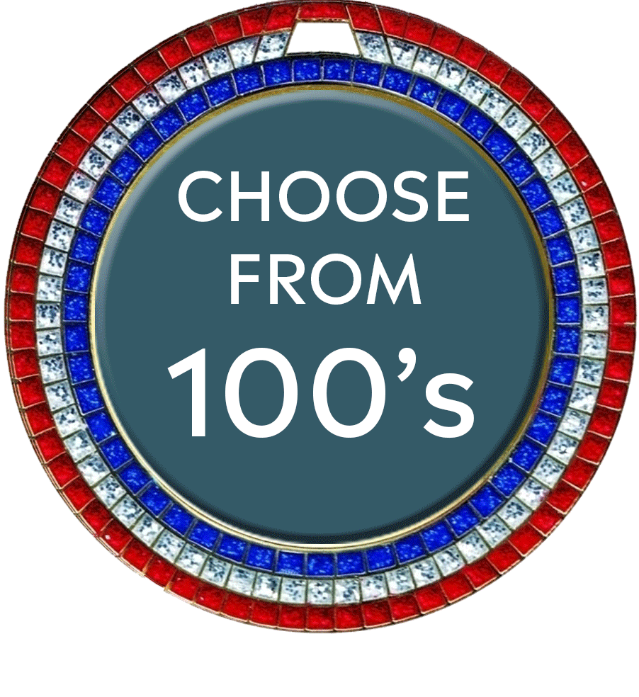 The Custom Bright Red White and Blue Gem Insert Medal allows you to pick one of our colorful inserts from our list of hundreds of activities and sports. Makes a great participation award for the whole team or league! Comes in Gold, Silver and Bronze with your choice of ribbon attached.