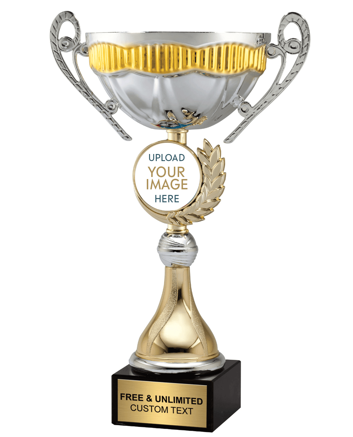 Celebrate achievement with this lovely silver and gold metal insert trophy! Available in three sizes, this cup has a lot of detail with an area for an insert sticker surrounded by a gold victory wreath. The best part about this great trophy cup is that you can upload your own artwork, logo or photograph. Engraving is free and unlimited!