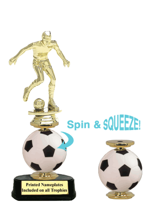 The Soccer Sponge Spinner Award is a #1 seller! These trophies are made of plastic on a weighted plastic base with a sponge ball that is 3″ in diameter. This trophy is great for all ages, the ball really spins!
